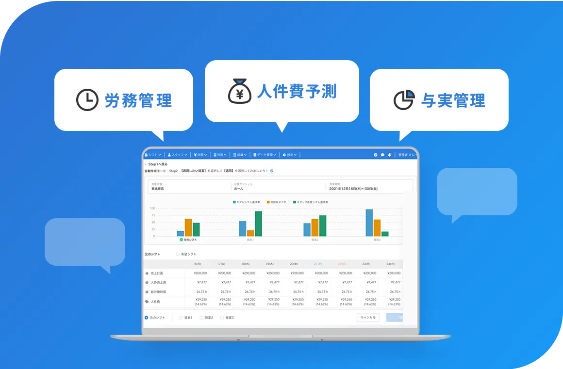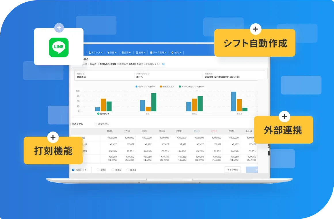 さらに勤怠・売上データ連携で予実管理もかんたんに、ヘルプ調整や労務チェック機能で現場の生産性向上を強力サポート。複数店舗の一元管理で人員配置や人件費率を横断的に把握し、スピーディな経営判断をサポートします。