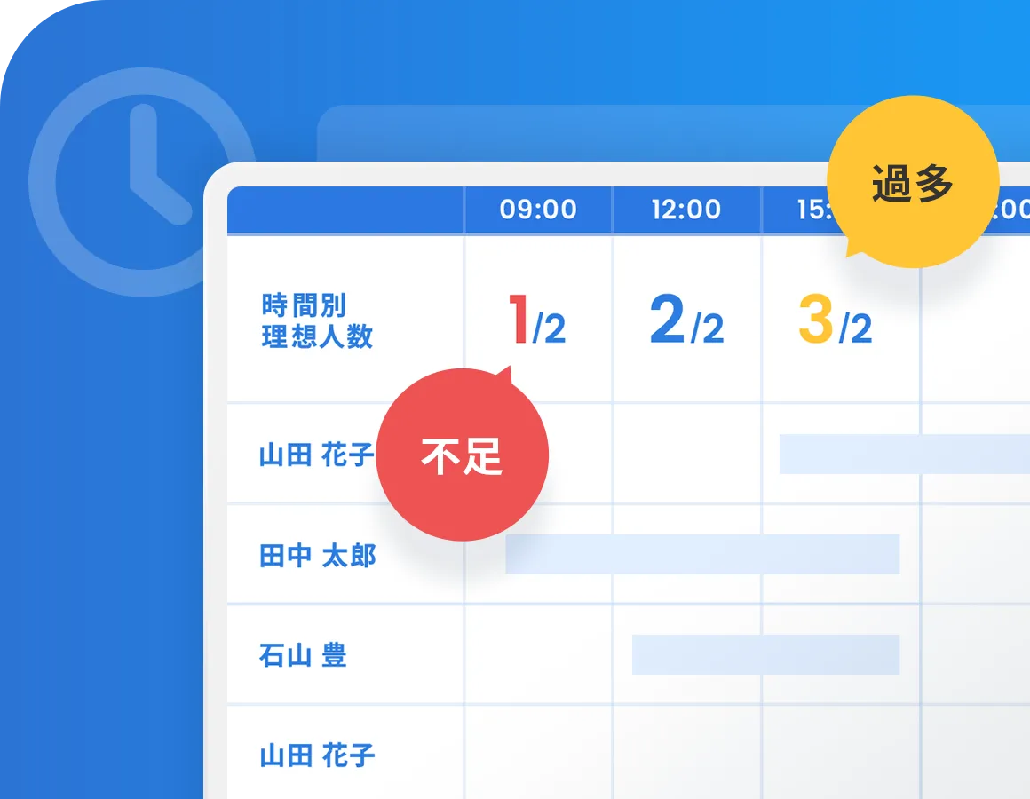 あらかじめ、時間帯別・ポジション別の理想人数(モデルシフト)を構築しておくこと、毎月のシフト作成業務を効率化します。属人化しがちなシフト業務を平準化します。