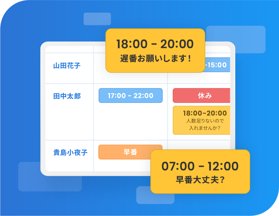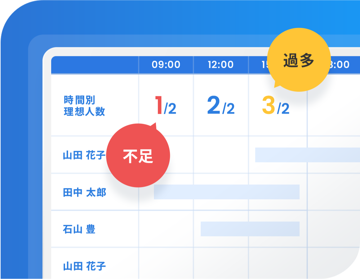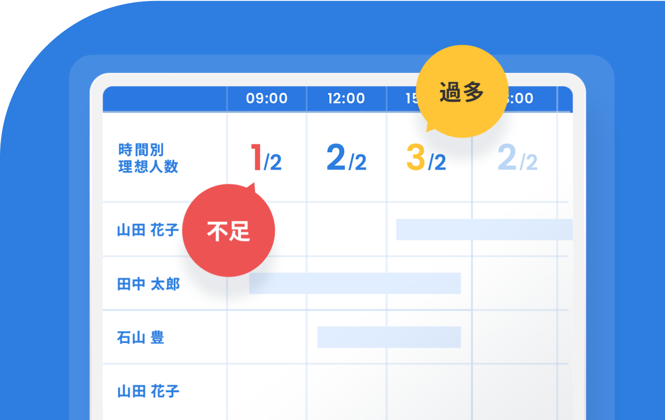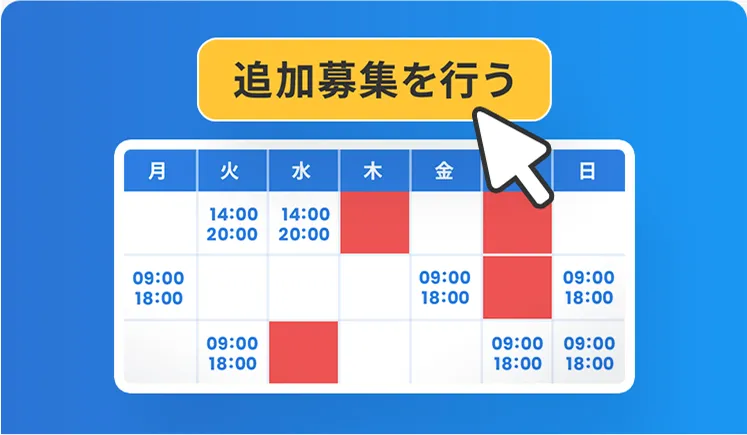 シフト調整のスピードと精度が大幅に向上し、人員配置ミスの防止、調整時間の短縮、人手不足の早期解決、マネジメントの負担軽減を実現します